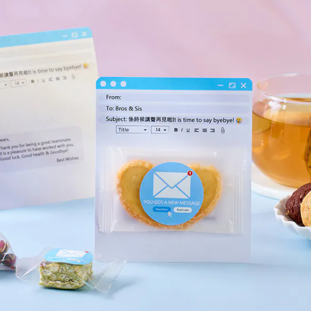 如果你希望在贈送散水餅的同時,向同事簡單致謝,可選擇以心意卡造型包裝,連同小點心一併送上,更顯心思。此款散水餅每份均附送心意卡,提供「Farewell Email」及「Farewell Keyboard」兩款設計,亦可加入公司 Logo、你的名字、離職日期或個人留言,令整份心意更具專屬感與紀念價值。特別適合希望禮物富有儀式感,同時以具視覺效果的方式呈現正式道別字句的上班族。