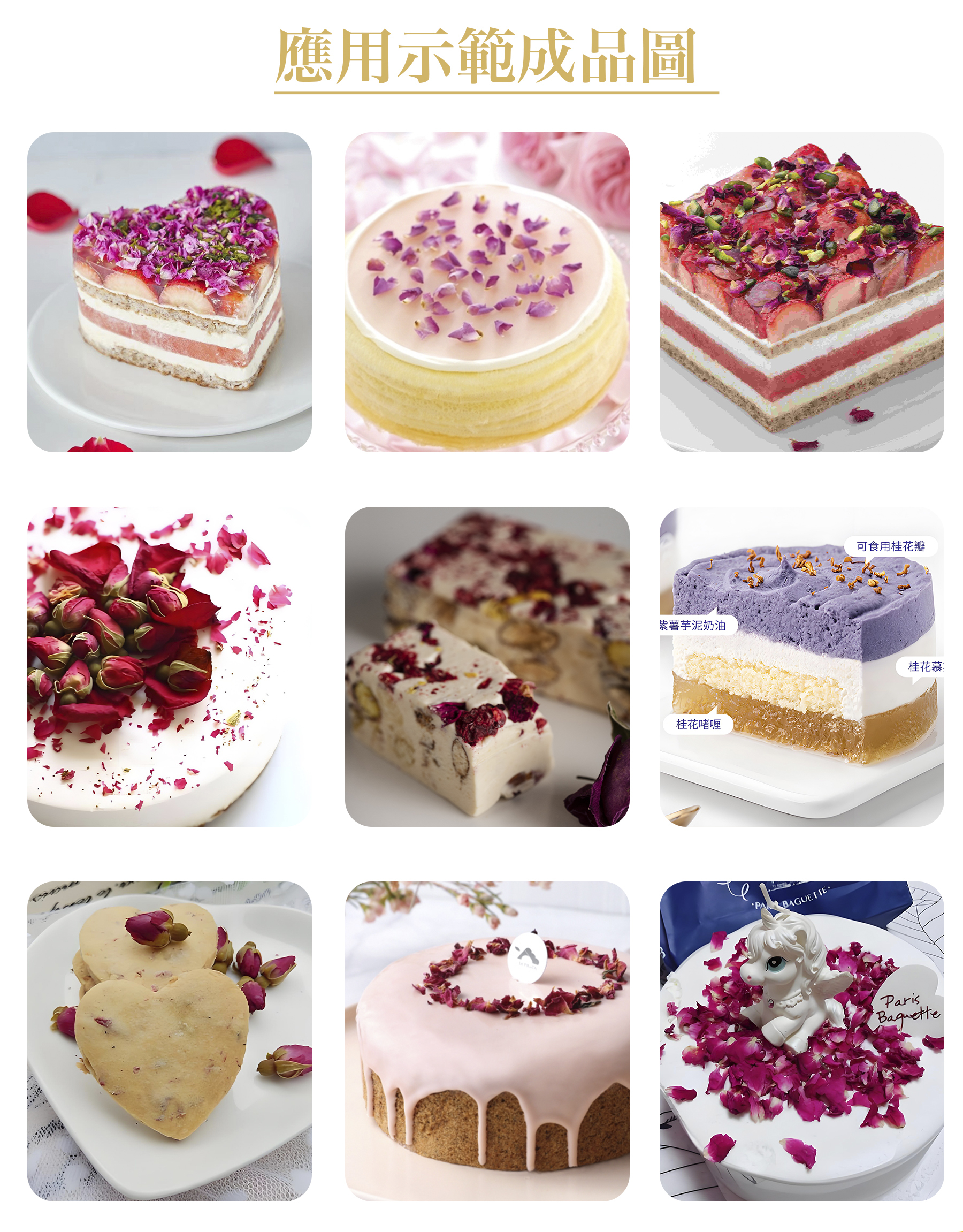 烘焙完成後,可以將整朵乾花或者新鮮花瓣作為裝飾放在蛋糕或餅乾表面,增加視覺效果。