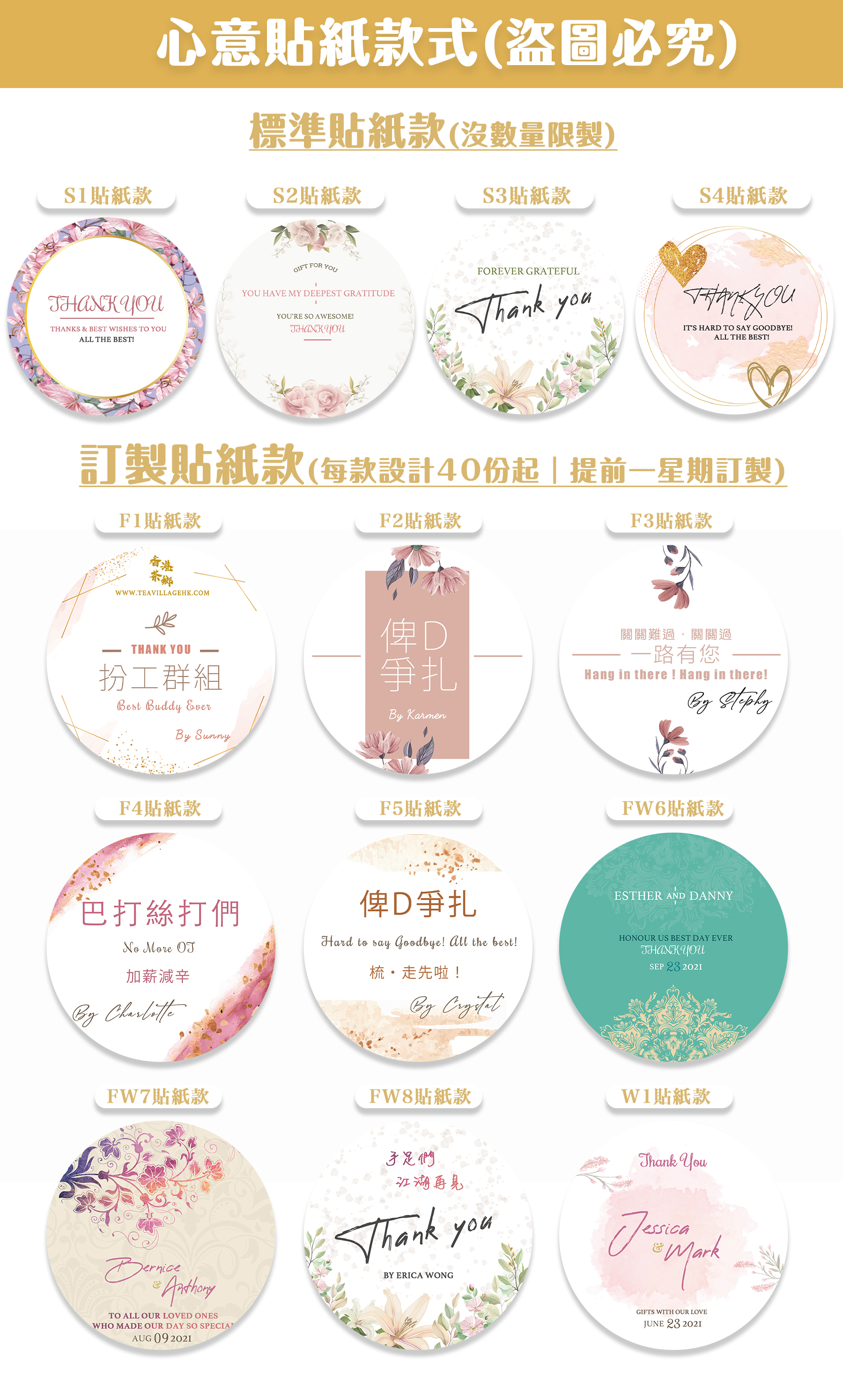 ・如需客製化心意貼紙(除S1,S2,S3貼紙款式外),每款需最少印製40份 (如不足40份,可額外付$60印製)