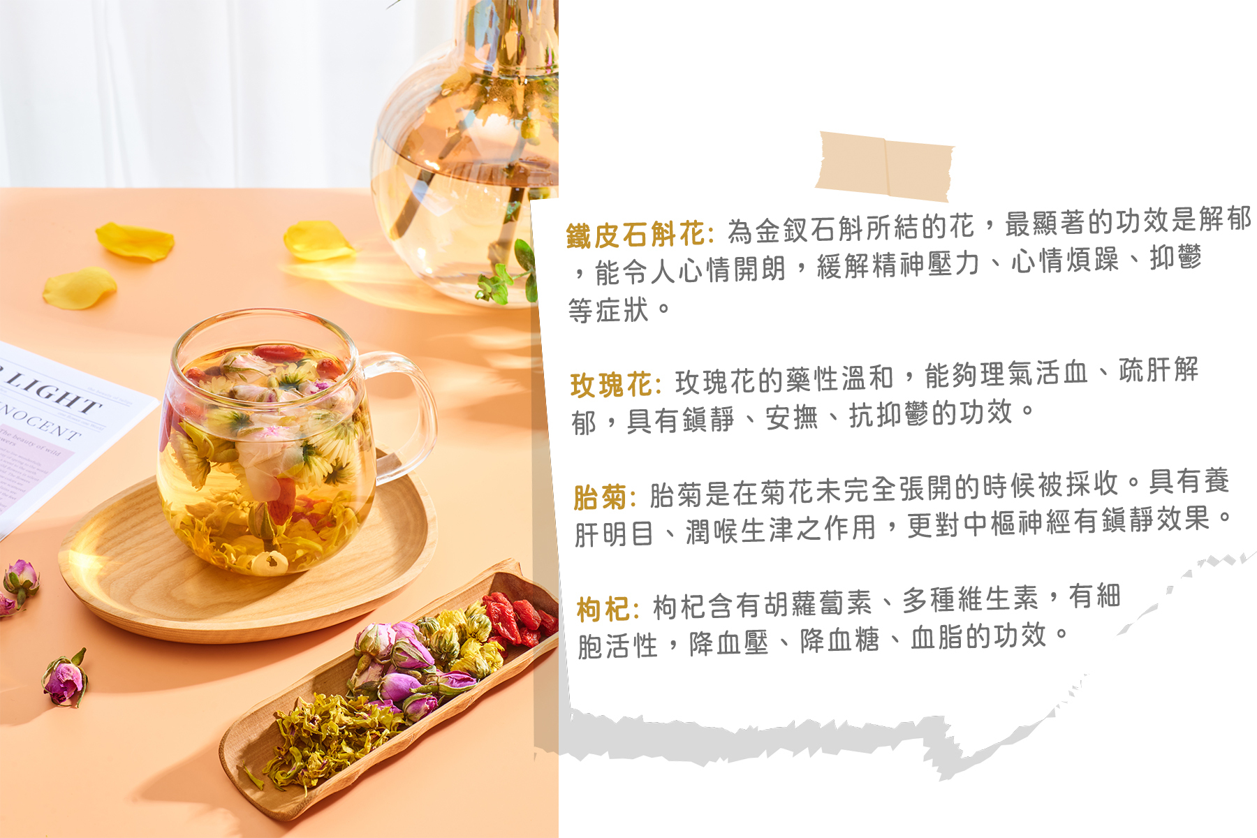 【配料】:鐵皮石斛花、枸杞、玫瑰花、胎菊