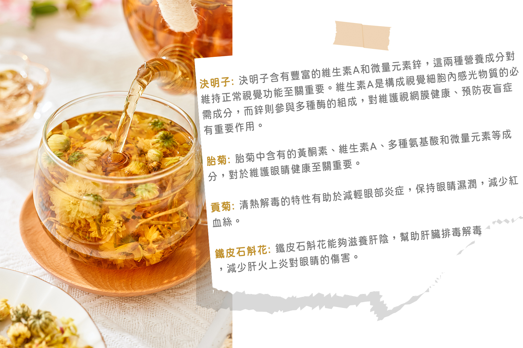 【配料】:金銀花、鐵皮石斛花、貢菊、胎菊、決明子