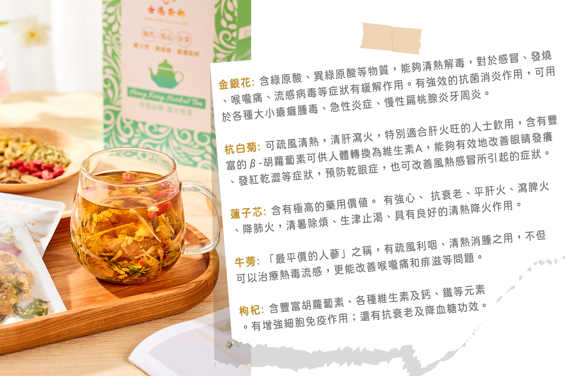 【配料】: 菊花、枸杞、金銀花、牛蒡、蓮子芯