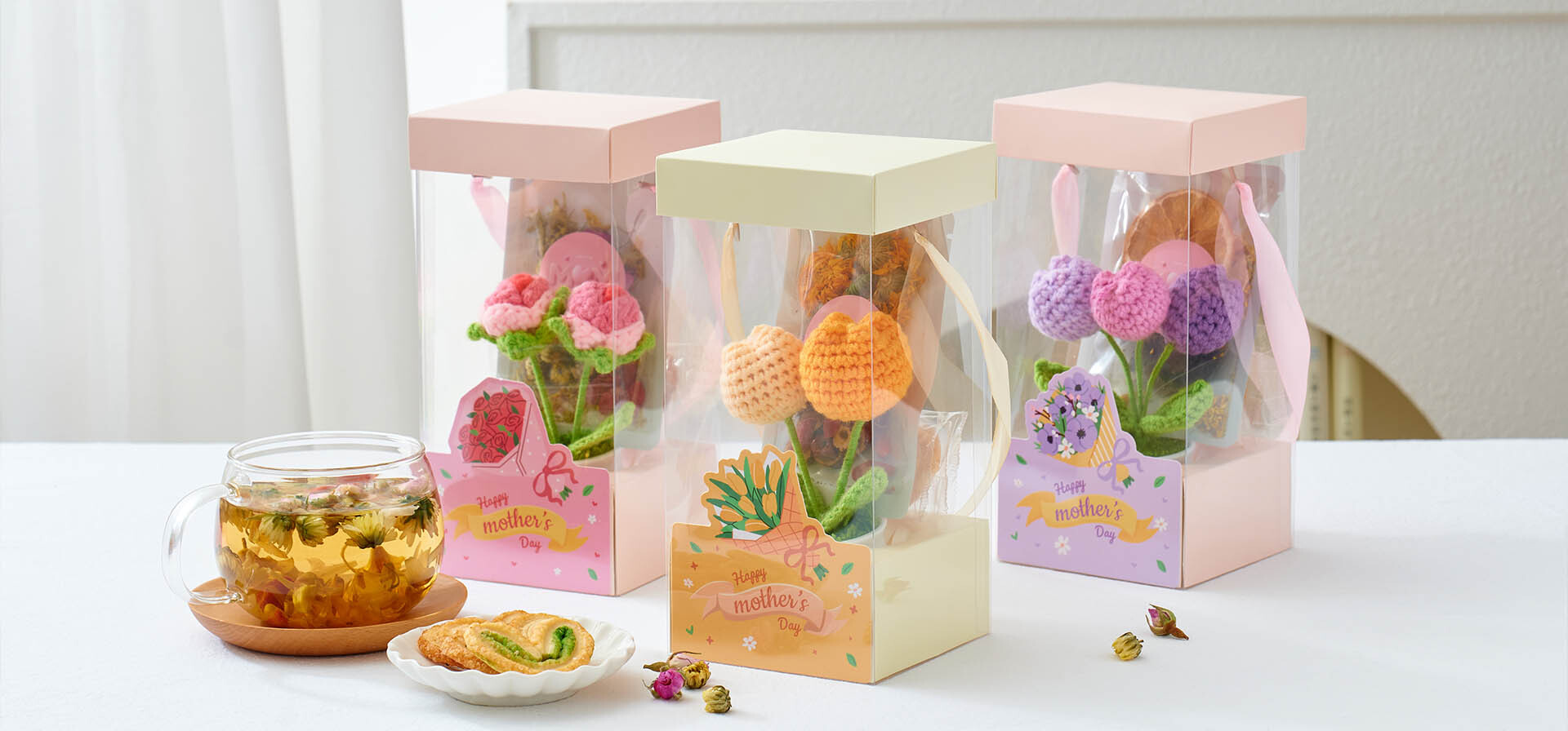 禮盒內含:療癒針織花盆栽 +養生花茶+香脆蝴蝶酥