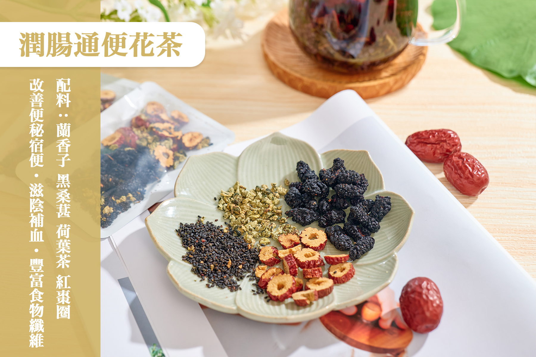 【包裝規格】: 獨立包裝潤腸通便花茶袋裝8包 (每包16克)