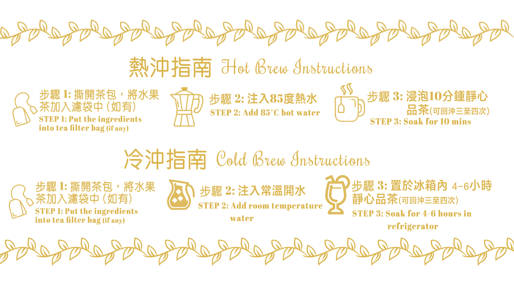 【冷泡方法】:撕開茶包,將水果茶加入濾袋中 (如有),注入常溫開水並置於冰箱內4-6小時即可飲用 (可回沖三至四次)