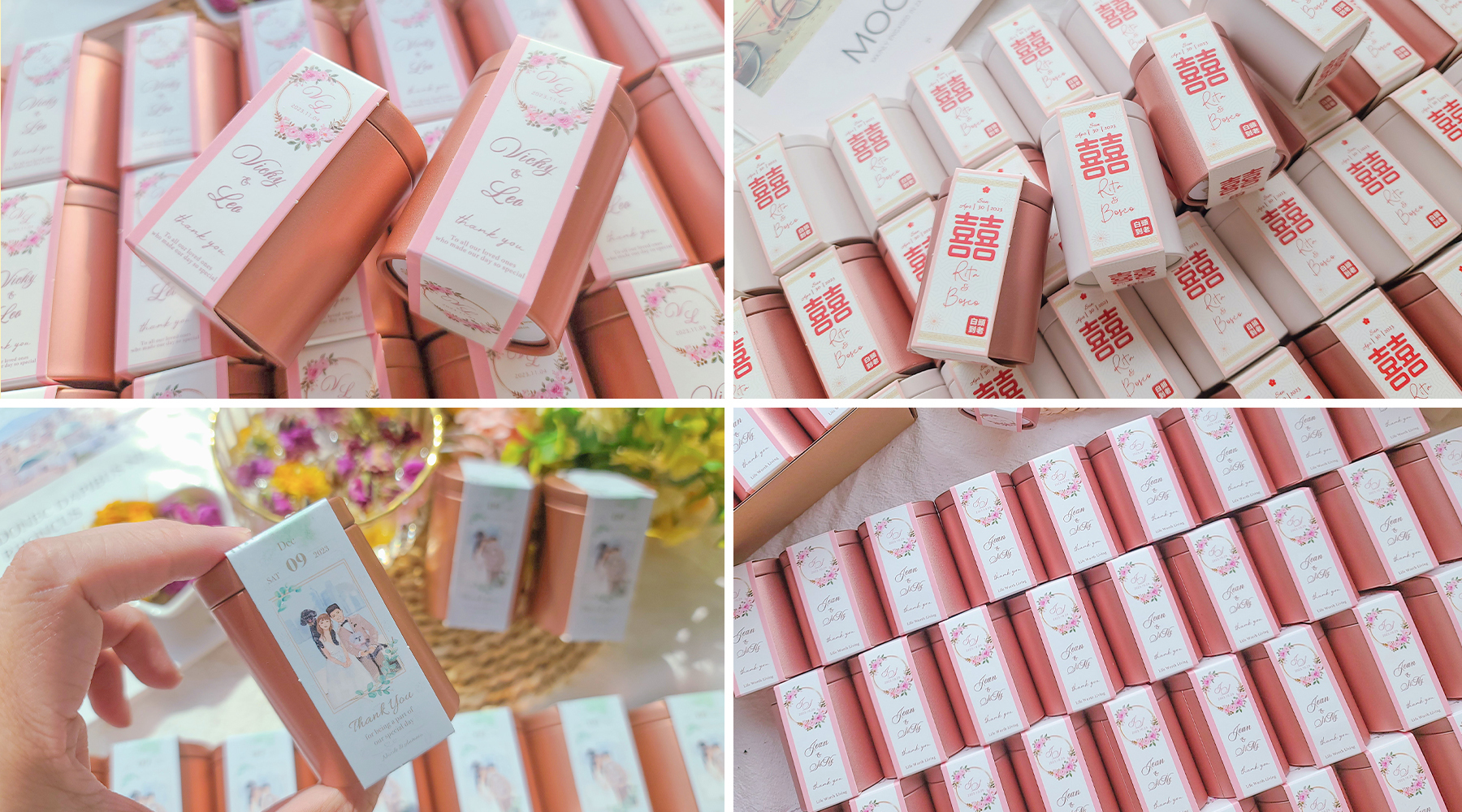 Step 1 - 選擇囍茶罐顏色,自訂腰封設計,印上新人名字、大好日子、特別祝福字句(設最低訂貨量)
