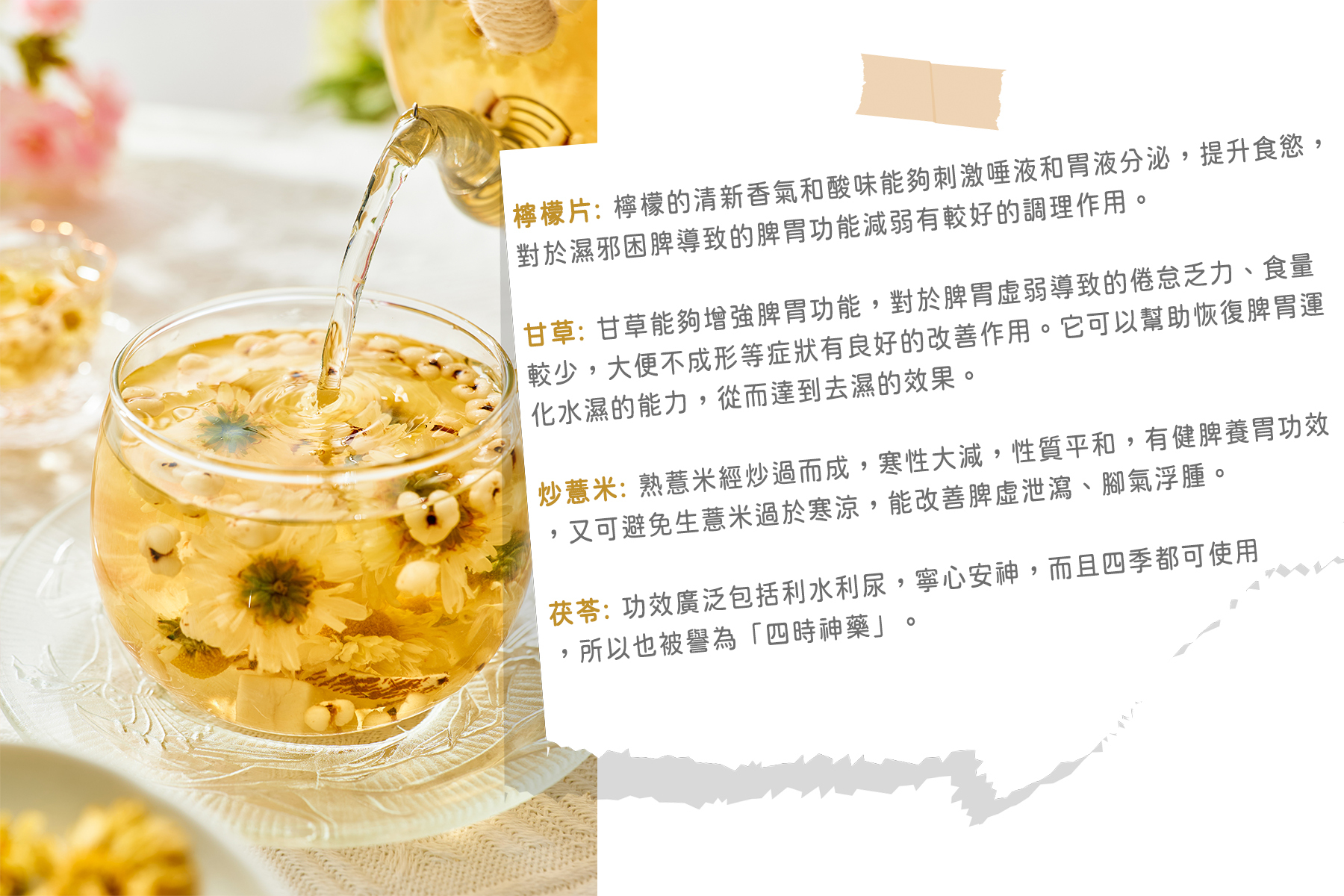 【配料】:炒薏米、茯苓粒、杭白菊、甘草、檸檬片