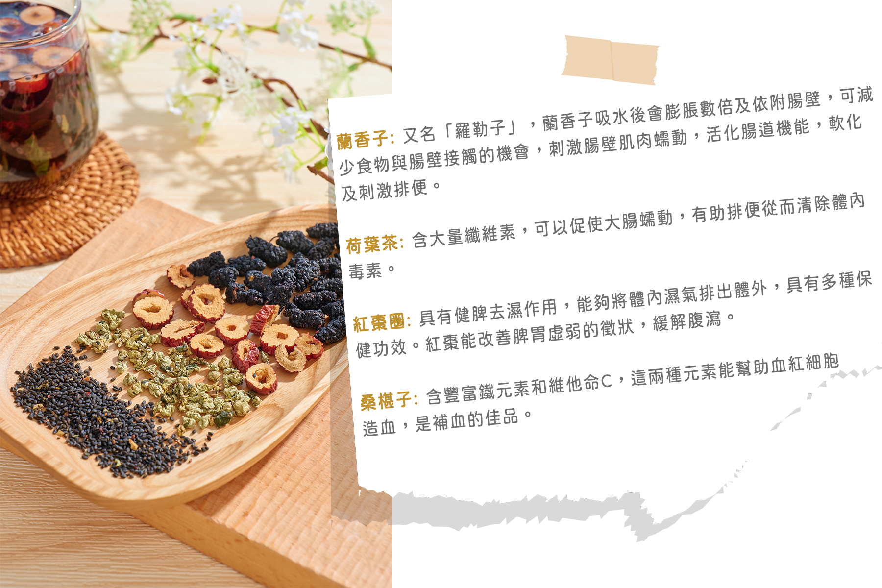【配料】:蘭香子、黑桑葚、荷葉茶、紅棗圈