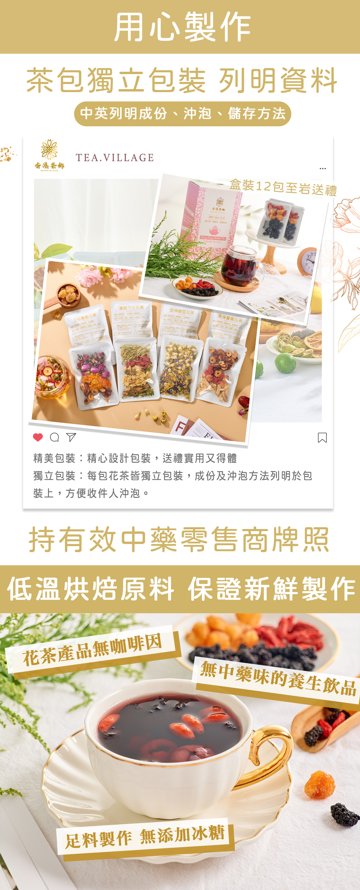 【套裝內含】:亮眼明目花茶x3、救肝活血花茶x3、黃金潤肺花茶x3、活力滿滿花茶x3