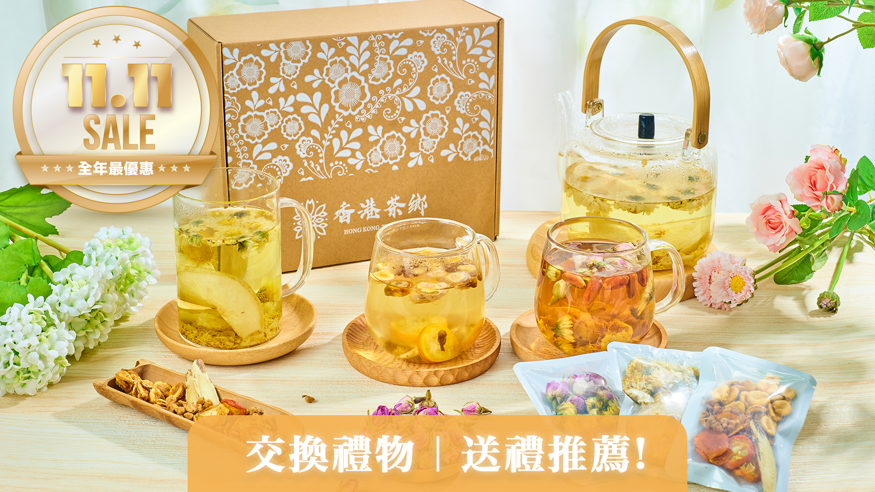 分享禮盒優惠組合:養生花茶11包+蝴蝶酥或朱古力曲奇或蔓越莓曲奇11份 $238
