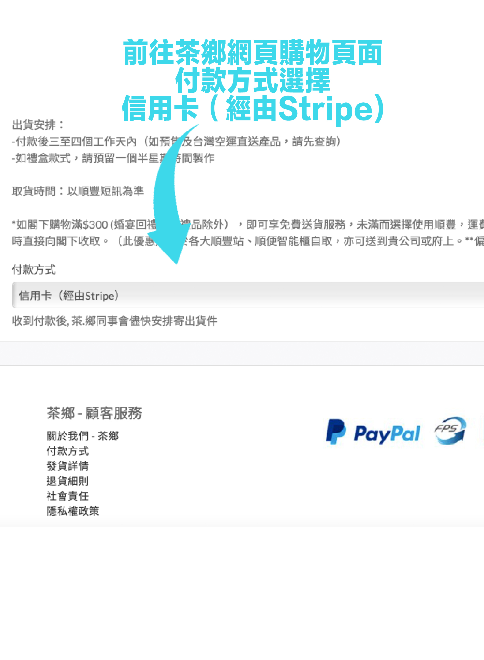 Step 5. 回到茶鄉網頁購物頁面,付款方式選擇「信用卡(經由Stripe)」
