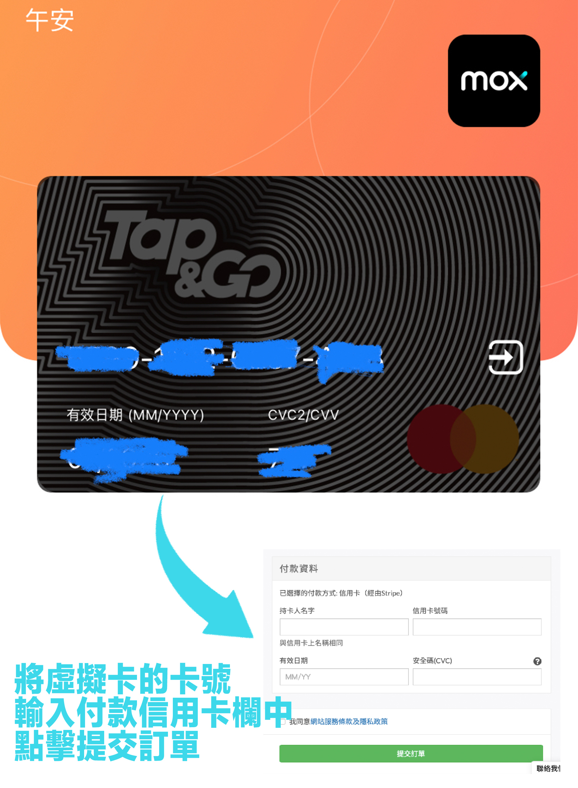 Step 6. 將虛擬卡的卡號輸入至付款信用卡一欄中,