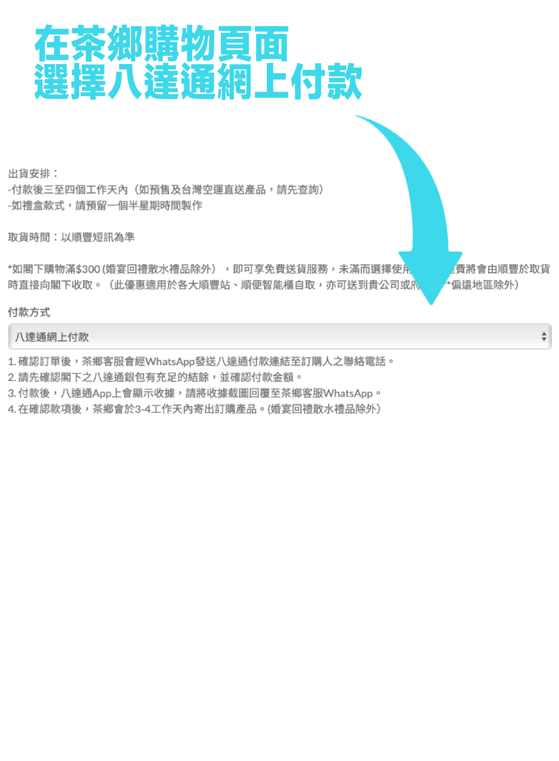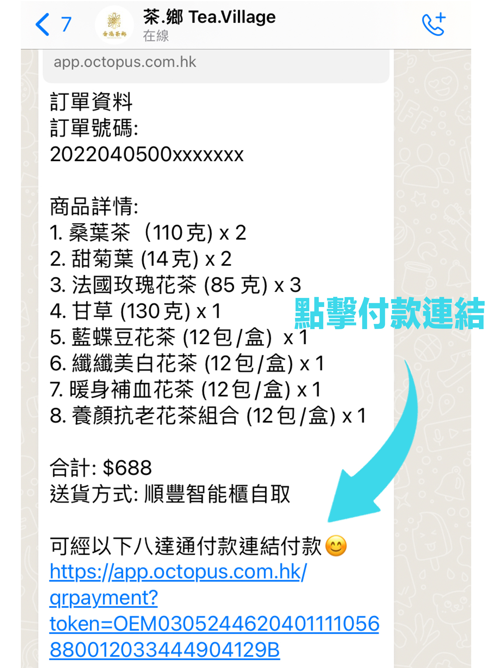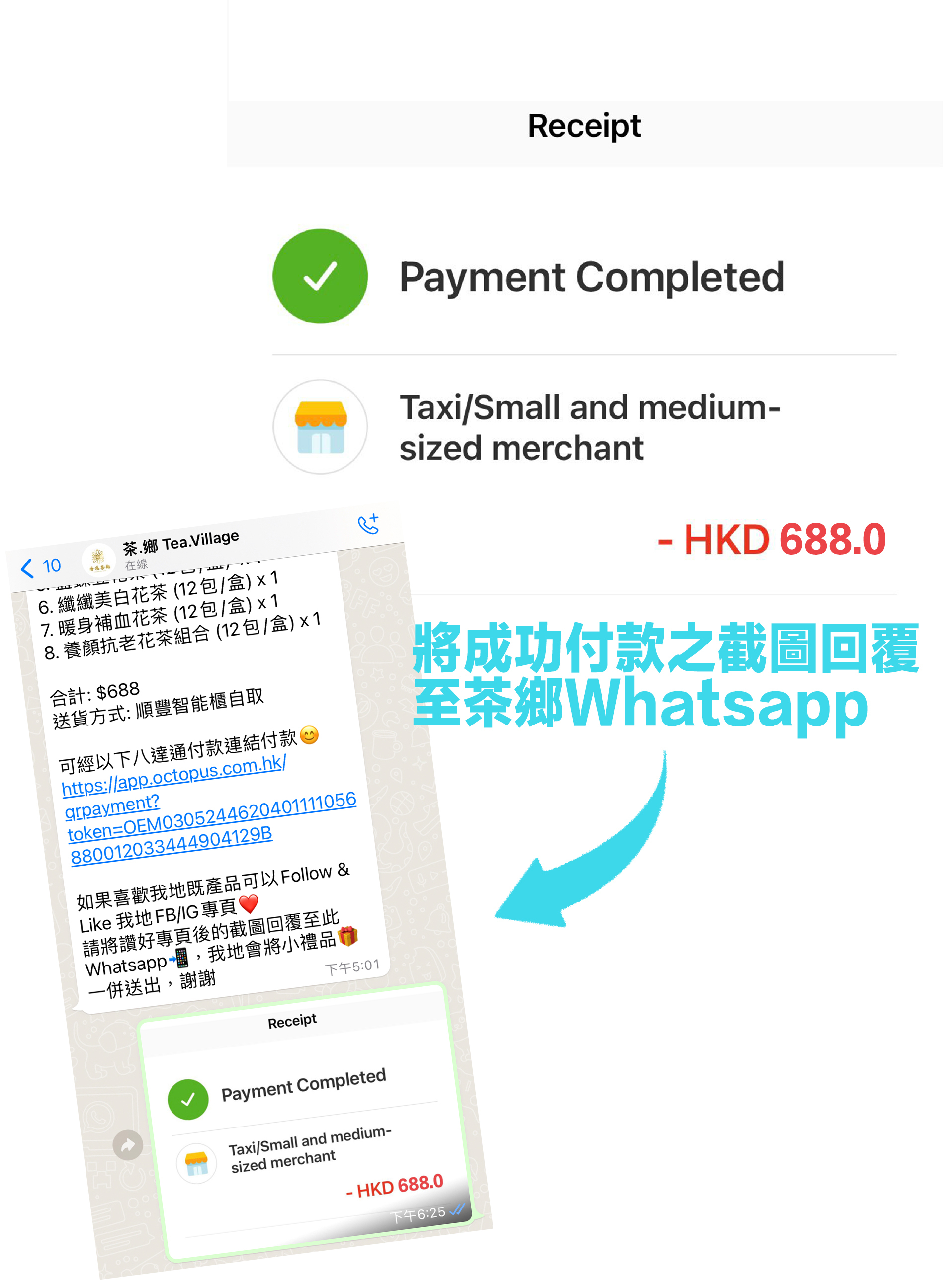 Step 6. 將成功付款之截圖回覆至茶鄉WhatsApp,即可完成購物