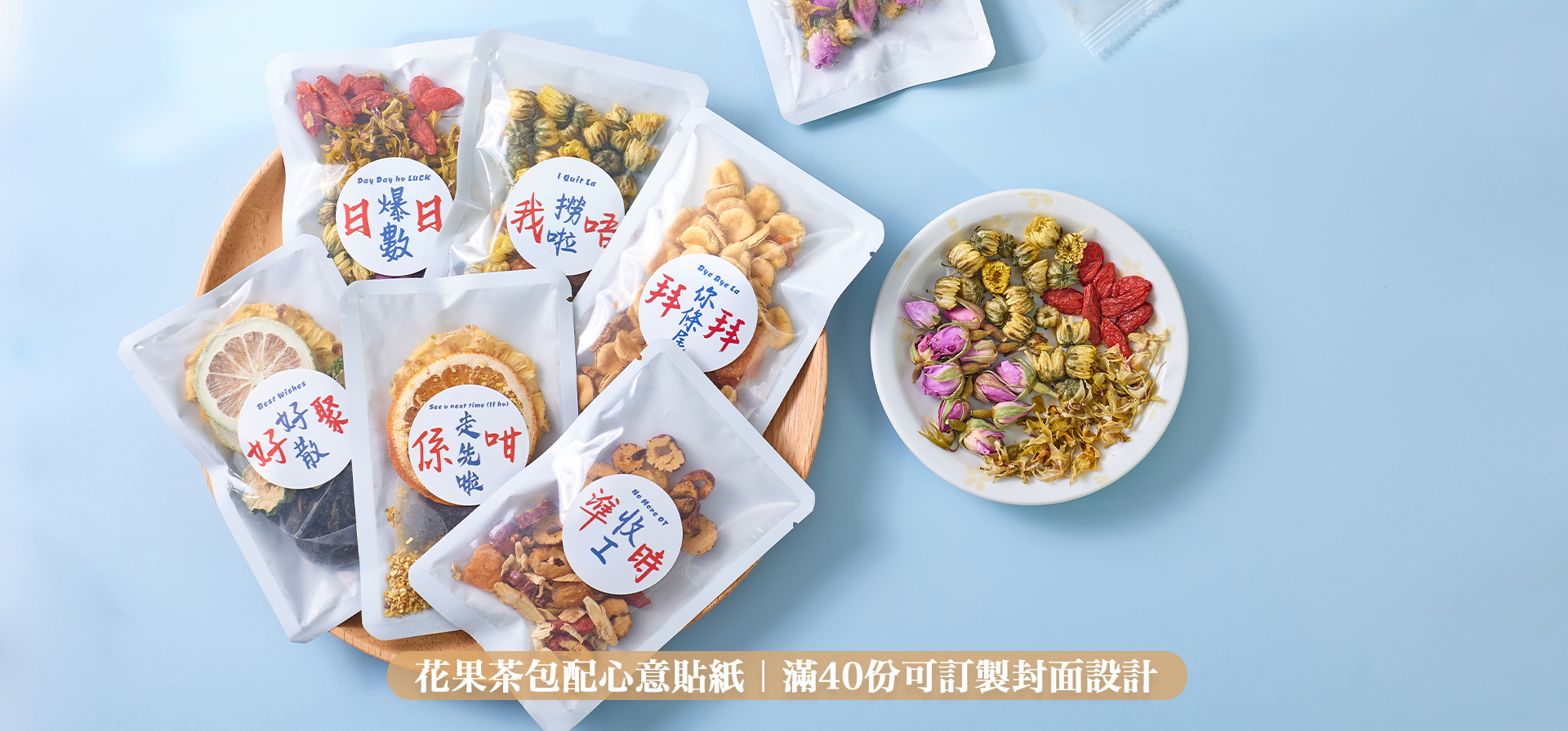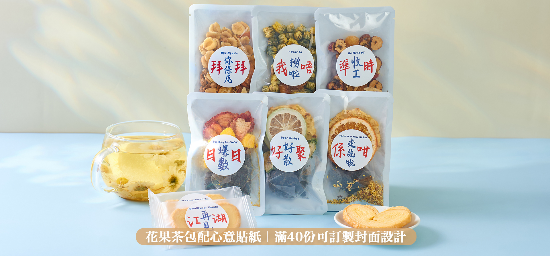 ・自訂心意:可自訂心意句子和留上下款,向不同同事送出最有心意的花茶禮物。(如需客製化心意貼紙,每款需最少印製40份 (如不足40份,可額外付$60印製)