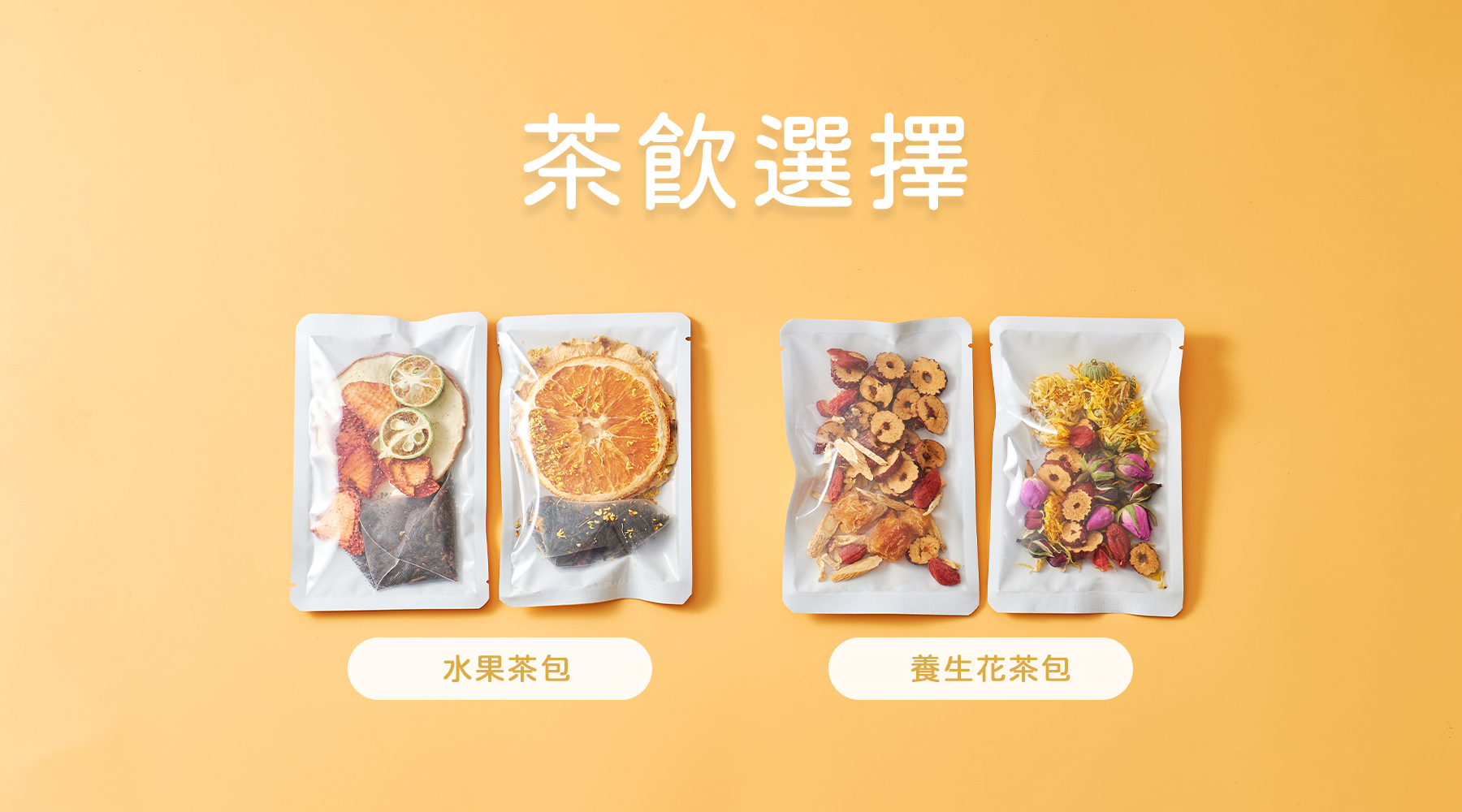 🍵茶飲: 養生花茶包、水果茶包、蜂蜜冰糖、黑糖