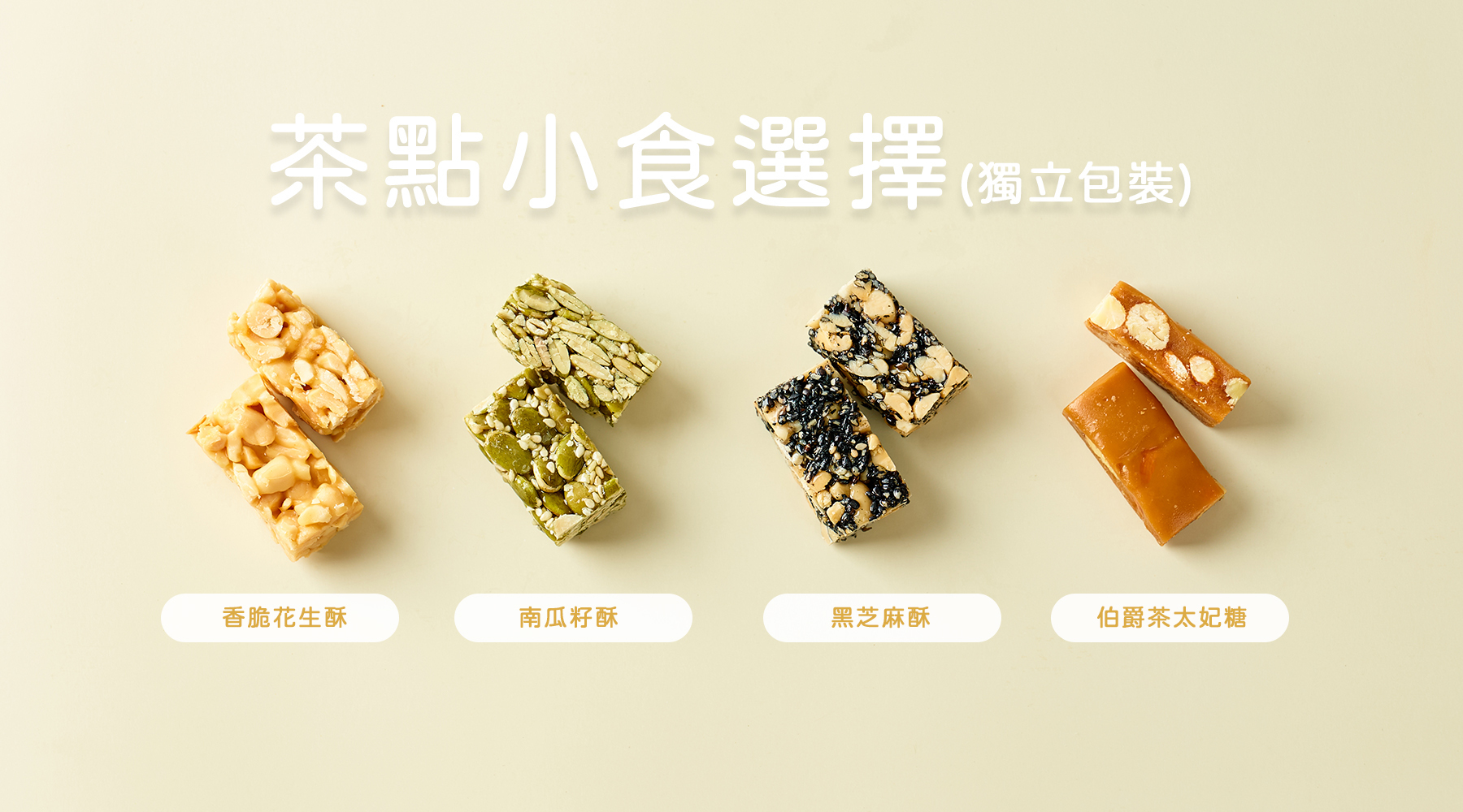 伯爵茶太妃糖、花生酥、南瓜籽酥、黑芝麻酥