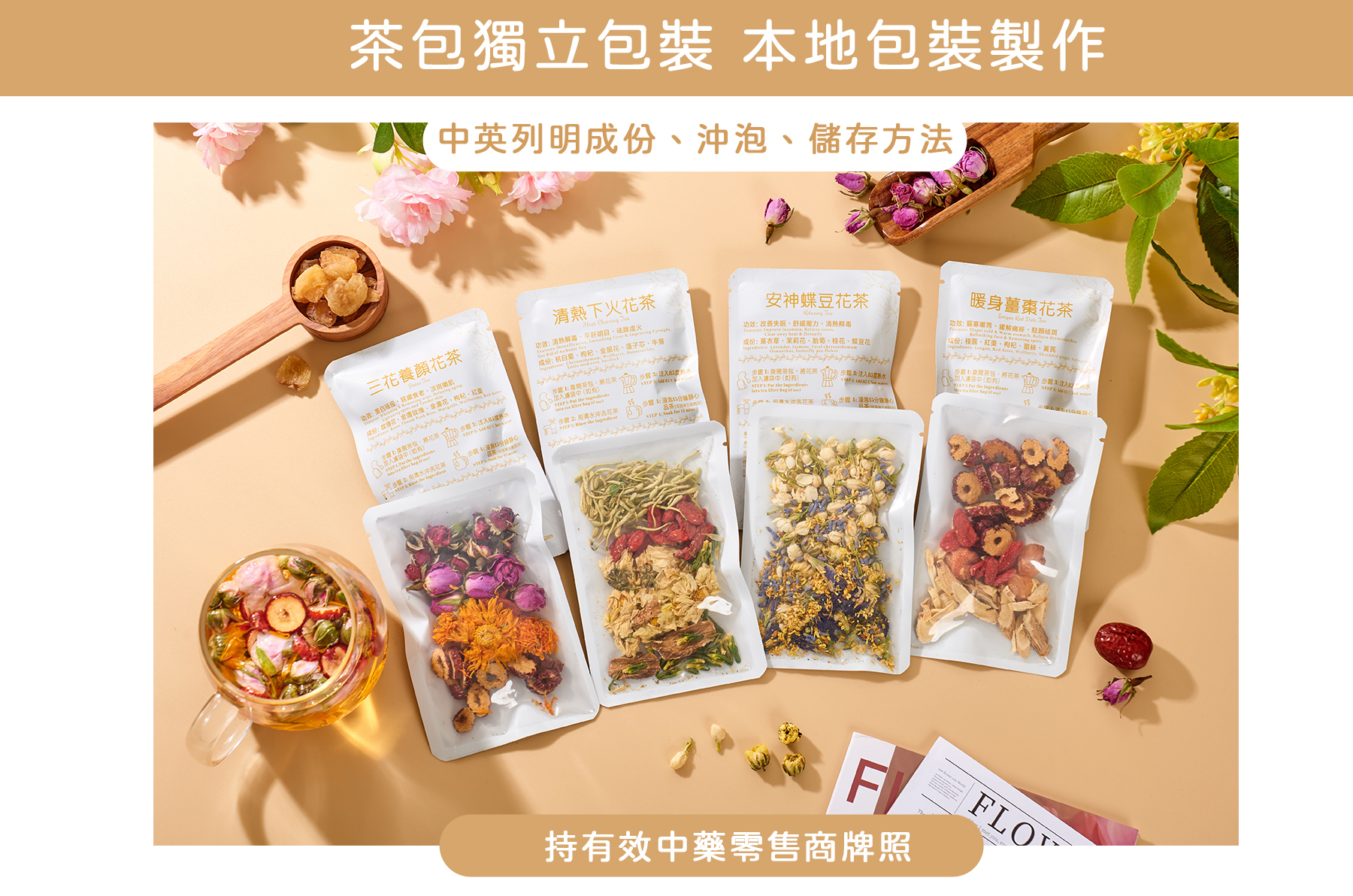 養生花茶包 - 香港自設持牌食品工場包裝及中藥材零售牌,品質嚴格監控。嚴選品質優良花茶原料,茶包用料絕非邊角碎料,確保每一口茶都醇厚豐盈。「一包茶包點止一杯」,足以陪伴您三回沖泡,溫和滋養的特性,寓意著對新人幸福安康的誠摯祝願,也為賓客奉上一份貼心暖心的健康好禮。